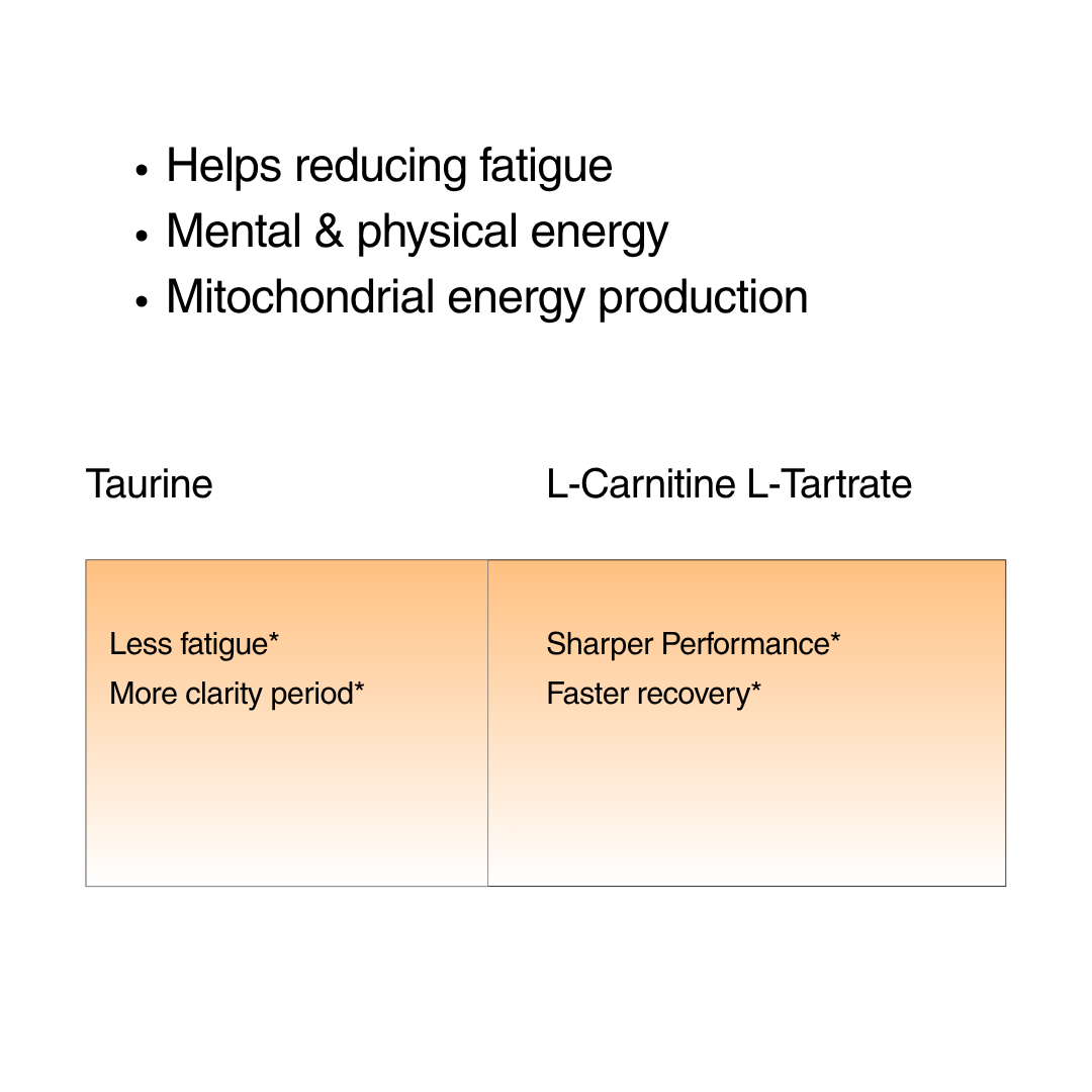 You feel a smooth lift in focus — energy without jitters. Taurine + L-Carnitine (L-Tartrate) power clean cellular energy while B-Vitamins support a calmer, sharper mind.