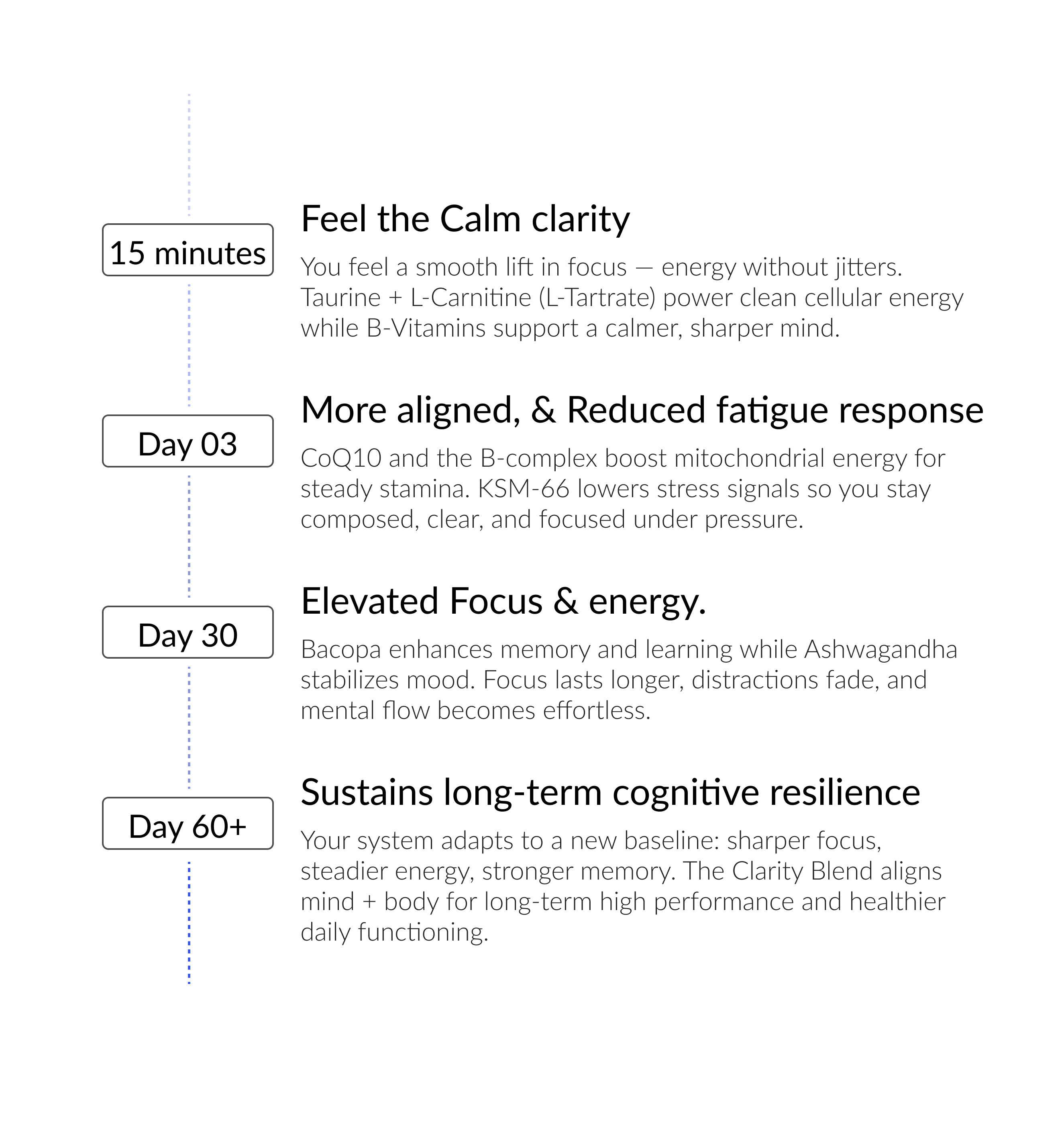 Your system adapts to a new baseline: sharper focus, steadier energy, stronger memory. The Clarity Blend aligns mind + body for long-term high performance and healthier daily functioning.